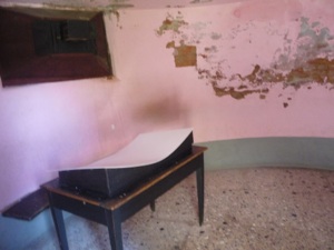 The camera obscuras are in one of the corner towers overlooking the entrance to the castle, where reputedly the contessa could scutinise visitors prior to entry. The optics consist of a meniscus prism which forms an image on a concave screen mounted on a low table as shown in the lower photograph. The chamber has a round wall with the system replicated on the opposite side.